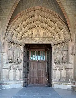 Les deux tours de la partie occidentale datent du XIIIe siècle, alors que le porche se trouve ouvert entre ces deux dernières. Sa triple arcature avec le trumeau du Christ fut détruite au XIXe siècle et ne fut jamais rebâtie devant la difficulté à obtenir à nouveau une pierre de cette qualité et de cet aspect. Les premières sculptures auraient été taillées dès 1245 alors que le portail propose de nombreuses statuettes gravées et bien conservées. Reste, qu'une partie du linteau semble manquer. Deux anges, quatre prophètes et huit vierges sont visibles. Ce portail est certainement le plus impressionnant dans tout le Maine avec celui de la cathédrale, datant lui, du XIIe siècle.