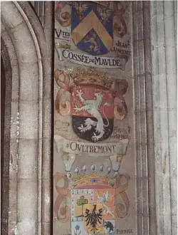 - Le monument funéraire du commanditaire a été sculpté par Mathieu van Beveren : un groupe allégorique en marbre blanc se composant de la Vertu, du Temps et de la Renommée, accompagnés d'un groupe d'anges se détache sur le fond noir. Le monument funéraire de son épouse, Anne-Françoise-Eugénie de Hornes, lui fait face. La deuxième partie est dominée par une statue de Sainte Ursule sculptée par Jérôme Duquesnoy le Jeune. Autour, deux génies symbolisant la Mort et la Vie par Grupello; dans des niches une allégorie de la Vérité par Jean van Delen et une allégorie de l'Espérance par Grupello. Sous la chapelle se trouve le caveau familial des Tour et Taxis. Lors de son ouverture en 1928, on y a retrouvé les ossements et les cercueils de dix-neuf membres de la famille, perturbés lors de la révolution française. Ils furent alors réunis dans un seul sarcophage[7]. Au sud, la chapelle Saint-Marcou, qui fait pendant à celle de Sainte-Ursule, a également été commandée par les Tour et Taxis. Son ordonnance est la même. Le portail d'entrée est surmonté d'une statue de saint Marcou accompagnée de la date « 1690 ». L'intérieur en faux marbre de couleur est décoré de diverses statues. Les verrières au-dessus de ces deux chapelles proviennent de fragments de vitraux anciens, datés de 1545, réunis à cet endroit par Samuel Coucke en 1861[8].