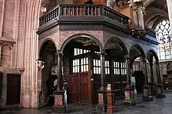 - Au-dessus de l'entrée principale se trouve une tribune d'ordre toscan en marbre noir et rouge, construite en 1684. Son plafond est orné d'un bas-relief de la barque miraculeuse, de Jean-Christian Hansche, ayant transporté la statue de la Vierge, un motif omniprésent dans l'église, entouré de deux saints.