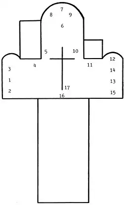 - Aux angles, les quatre évangélistes, identifiés par leurs attributs traditionnels : saint Matthieu (ange), saint Marc (lion), saint Luc (bœuf), saint Jean (aigle)