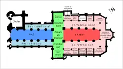 Le chœur est flanqué de deux collatéraux simples de six travées, dont chacune s'accompagne d'une chapelle. Les chapelles devant la première et la seconde travée sont réunies et communiquent également avec les croisillons du transept. Elles sont toutefois placées à l'origine sous deux vocables différents par chapelle double. Les chapelles devant la cinquième et la sixième travée sont également réunies mais placées sous un seul vocable. La chapelle de la sixième travée possède un mur biais entraînant un voûtement par deux voûtes tripartites, et son plan est trapézoïdal, réduisant ainsi la dimension de la dernière travée du collatéral qui reste carrée et se termine par un chevet plate. Afin d'assurer la transition, le plan de la cinquième travée du collatéral est losangé, et l'arcade vers la chapelle est placée en biais, si bien que la travée de la chapelle est également trapézoïdal. Les sixièmes travées des deux collatéraux encadrent une chapelle d'axe, et plus précisément sa première travée, la seconde travée étant une abside à cinq plans placée hors œuvre. La chapelle d'axe est consacré au Saint-Sacrement. Sachant que la chapelle devant la troisième travée du collatéral nord contient dès l'origine la sacristie (bien que dédiée à saint Nicaise[27]), et que les deux dernières chapelles sont dédiées à un même saint, l'on obtient ainsi un total de dix chapelles. Du nord au sud dans le sens de l'aiguille de l'horloge, les chapelles sont les suivantes :