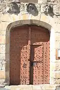 Le portail d’entrée de l’église est constitué de vantaux cloutés ; il est surmonté de pierres sculptées, vraisemblablement de réemploi.