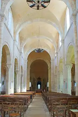 La voûte en plein-cintre est située à 12 m du sol. Les 12 colonnes de la nef et du chœur, flanqués de quatre colonnettes, cantonnées en croix, ainsi que huit colonnes supportant la demi-coupole du sanctuaire sont surmontées de chapiteaux sculptés représentant des scènes de la Bible ou des feuillages, ils sont l’œuvre du sculpteur Jean Guillaumet[réf. nécessaire]. Les vitraux des bas-côtés, du transept et des chapelles de l’abside, œuvres de Lucien-Léopold Lobin, représentent des saints protecteurs. Les fenêtres hautes de la nef ne comportent pas de verrières décorées, elles sont une soixantaine qui donne à l'édifice une grande luminosité. Quatre lustres en fer forgé accrochés aux voûtes de la nef et du transept assurent le chauffage et une partie de l’éclairage.