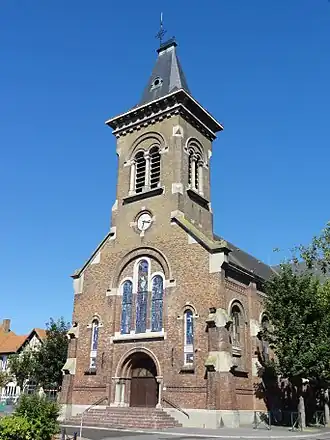 L'église vaste et claire en briques et ciment, d'architecture néo-romane, est en forme de croix latine dont le transept est à peine esquissé. Elle est orientée au Nord. La façade est surmontée d'un clocher dans le style régional, lui-même coiffé d'une haute flèche d'ardoises.