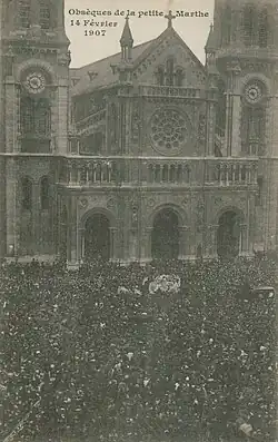Le , une foule estimée à environ 50 000 personnes se presse dans l'église Saint-Ambroise, sur le parvis et dans les rues adjacentes pour assister aux obsèques de la petite Marthe Erbelding, une enfant de onze ans, violée, tuée et dépecée par son assassin Albert Soleilland[9],[10],[11]. Tuée le 27 janvier, son corps n'est découvert que le 8 février dans une malle laissée à la consigne de la gare de l'Est. Soleilland — un voisin des parents — est condamné à mort[12],[13],[14] le 24 juillet par les Assises de la Seine. Gracié par le président Armand Fallières, il est conduit au bagne de Guyane et meurt de la tuberculose en mai 1920 à l'hôpital de Kourou.