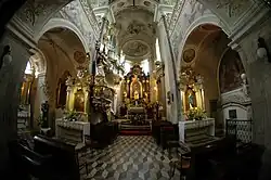 La polychromie de la coupole représente le Jugement dernier et celle du presbytère la glorification des saintes Claire, Salomé et Kinga de Pologne avec le couronnement de Notre-Dame dans l'abside. Dans le maître-autel se trouve une peinture de St-André, et dans l'autel un tabernacle baroque du XVIIIe siècle. Il y a aussi un orgue historique à 8 voix dans le presbytère.