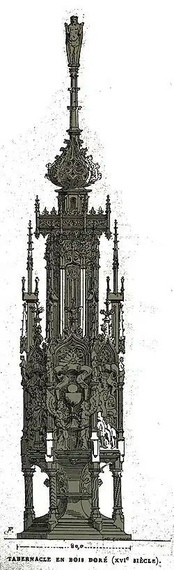 Une tour eucharistique gothique en bois doré et peint avec cinq scènes : saint André, Moïse (2 fois), saint Christophe, 2 anges présentant 1 calice[9].
