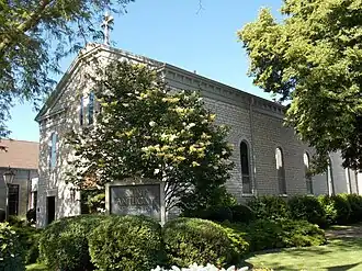 Le père Mazzuchelli dessine les plans d'un bâtiment à deux étages comprenant l'église et la résidence du prêtre. L'ensemble est consacré par Mgr Mathias Loras, le . Il est construit en briques de Davenport que l'on commençait à fabriquer. On y trouvait également une école, une cour de justice, la salle municipale, etc. et la cloche sonnait non seulement pour les messes, mais également pour les incendies, les heures de classe et les réunions municipales. Elle avait une petite chorale où chantaient Le Claire et le juge Mitchell qui offrit ensuite une parcelle de terrain pour y aménager le premier cimetière paroissial de la ville, et deux autres pour construire deux églises dans les quartiers ouest. Il n'y avait pas d'orgue et l'on chantait accompagné d'un violon, ou bien d'un violoncelle, d'une clarinette ou d'une flûte.