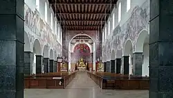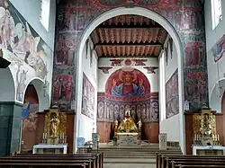 À l'intérieur, en plus de nombreuses fresques, l'immense représentation du Christ dans l'abside attire tous les regards. Cette fresque est l'œuvre de Georg Winkler, originaire de Ratisbonne, qui a conçu l'ensemble de la décoration intérieure. Le maître-autel a été réalisé par la maison Haber & Brandner; les sculptures ont été conçues par Guido Martini; les peintures sur verre ont été réalisées par deux firmes de Ratisbonne, Schwarzmeyer et Schneider. Les vitraux n'existent plus car ils ont été bombardés pendant la Seconde Guerre mondiale.