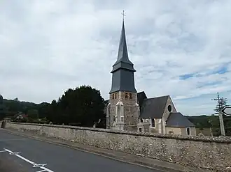L'église possède un clocher tors, unique dans le département de l'Eure, haut d'environ 60 mètres[9], il est recouvert d'ardoise à partir de sa base carrée ; la flèche devient octogonale et tourne de gauche à droite d'1/8e de tour. Son unique cloche datant de 1833 se prénomme « Charlotte »[10].