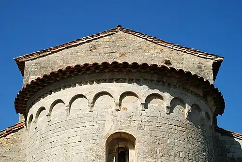 Ce chevet est orné d'arcatures reposant sur des modillons géométriques, ainsi que d'une frise de dents d'engrenage.