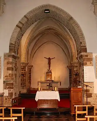 Mais ce qui fait assurément l'intérêt de cet intérieur, c'est le chœur. Précédé par un bel arc triomphal ogival reposant sur des pilastres faits de moellons de pierre blanche et de grès ferrugineux, le chœur est rythmé par quatre remarquables colonnes engagées faites de blocs de grès ferrugineux surmontés de chapiteaux ornés de motifs végétaux stylisés rehaussés de dorures. De ces chapiteaux s'élancent les nervures de la voûte d'ogive du chœur dont les voûtains sont peints en blanc, contrairement à la voûte de la nef et aux voûtains des collatéraux faits de briques rouges.