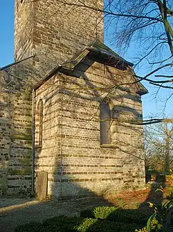 Dominant le chevet, l'église conserve un clocher roman présentant une maçonnerie faite principalement de moellons de grès ferrugineux assemblés en appareil irrégulier et parsemée de blocs de grès blanc, sauf la base qui est uniformément blanche.