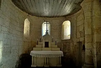 Les trois baies romanes de l'abside, en plein cintre, portent des décorations géométriques. Les deux baies du chœur, plus tardives, sont sans décoration.