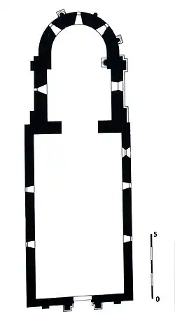 L'abside se décompose en sept pans, deux pour le chœur et cinq pour la partie semi-circulaire.