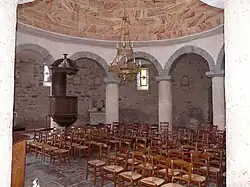 La nef, partie circulaire centrale de l'édifice, est entourée de colonnes. Un bas-côté fait le tour de la nef et le chœur, situé à l'est, est éclairé par un oculus[3]. Dans son prolongement se situe la sacristie[3].