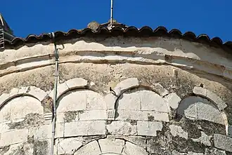 Le registre inférieur, très haut, ne présente aucune ornementation, alors que le registre supérieur est percé de trois fenêtres cintrées et orné d'arcades retombant sur de petits culots ornés de motifs géométriques variés (croix, stries verticales, stries horizontales). Cette arcature est surmontée d'une corniche biseautée.
