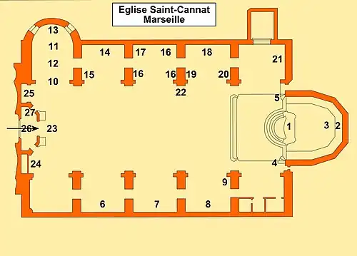 1- Maître-autel (Dominique Fossati). 2- Tableau de Notre-Dame de la paix (Pierre Bernard). 3- Orgue de chœur. 4- Statue de saint Cannat. 5- Statue de saint Dominique. 6- Tableau de la Vierge au rosaire (Bronzet ainé). 7- Tableau de la Vierge, de l'enfant et du Purgatoire (Michel Serre). 8- Tableau représentant la vision de saint Pie V. 9- Statue de sainte Thérèse de Lisieux (François Carli). 10- Grille du baptistère. 11- Fonts baptismaux. 12- Statue de Notre-Dame du Mont Carmel. 13- Tableau représentant le baptême du Christ (Pierre Parrocel). 14- Gisant du Christ (sculpture de Simon). 15- Tableau la Vision de saint Benoît (Jean-Baptiste de Faudran _ 1611-1669),