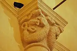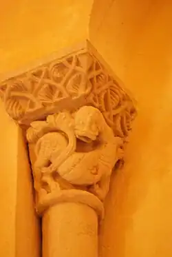 Fenêtre orientale, chapiteau sud : thème animalier à contenu symbolique : Sur la corbeille, deux grands mammifères à tête d'oiseau ou de reptile sont dressés dos à dos verticalement. Entre eux, se trouve le protomé d'un lion placé à l'angle de la corbeille. La composition est de type pseudo-héraldique, avec autour du « chef » des animaux rampants qui lui rendent hommage. La métamorphose des queues est traditionnelle : elles sont anatomiques jusqu'au passage entre les cuisses, puis, en sortant sous le ventre, elles se transforment en lianes trinervées qui s'unissent en un nœud. Ce genre de mise en scène affichait souvent d'autres attributs du Péché.