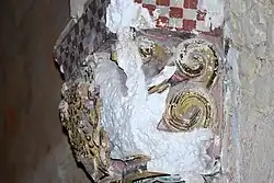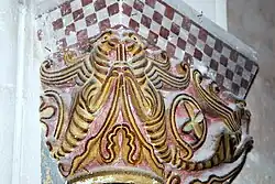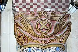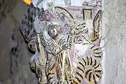 Il s'y trouve quatre doubles chapiteaux à corbeilles figurés. Ils datent d'un reconstruction partielle du chevet au XIIe siècle. Leur iconographie s'inspire de celle de l'abbaye de La Sauve-Majeure. Autour de l'autel, l'endroit la plus sacré de l'église, réservé aux clercs, on trouve des monstres et animaux maléfiques. Dans les églises romanes, l'imagerie réservé aux clercs se préoccupait davantage d'édification morale que de doctrine. Les quatre espèces représentées autour de l'autel : basilic, aspic, lion et dragon sont les quatre ennemis traditionnels de Dieu et de l'Homme — « Tu marcheras sur le basilic et l'aspic, tu fouleras aux pieds le lion et le dragon » (psaume 90) —. Ces bêtes ont été sculptées comme avertissement aux clercs qui servaient deux maîtres, approchant Dieu par le calice tout en restant asservis au Démon, métamorphosé en bête maléfique. L'archange saint Michel est là pour apporter l'espoir au pécheur.
