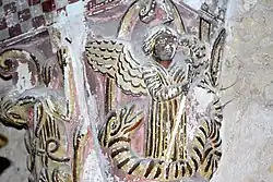 Sur le doubleau de la voûte, des motifs géométriques de couleur ocre rouge sur fond ocre jaune attestent l'existence d'un décor peint à l'époque romane. Dans la première moitié du XVIe siècle, le sanctuaire reçoit de nouvelles peintures représentant les quatre évangélistes. Saint Jean écrivant sous la dictée de son symbole, l'aigle, est bien conservé. Coiffé d'un turban rouge, le visage d'un second évangéliste est aussi visible. On peut penser que ces figures sous arcades complétaient le programme iconographique d'un retable. Sur les voûtes, il y a des traces de peintures : le soleil, la lune et un mandorle…