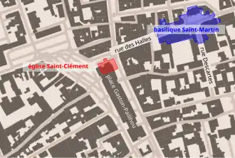 L'église Saint-Clément se situe à Tours (Indre-et-Loire, France), dans la partie nord de la place Gaston-Paillhou. Son mur nord était en alignement des façades bordant le côté méridional de la rue des Halles[1].