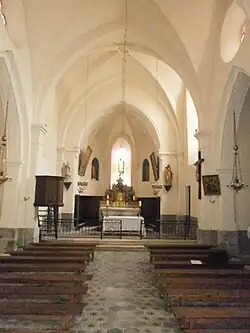 Composée d’un clocher-mur sur la façade principale surmontant le portail d’entrée, l’église est à une seule nef voûtée en croisées d’ogive. Son plan rappelle celui d’une croix latine avec deux petites chapelles naissant dans la nef. Une astuce architecturale permet de passer d’un chevet « plat » à une abside à cinq pans [5].