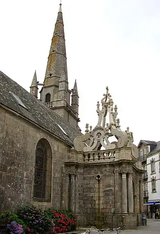 Le porche de la façade nord est sculpté par Kergoustin[4], de Baud, et date de 1792 ; c'est une architecture dorique à colonnes en pans coupés, est surmonté par un baldaquin à ailerons, une couronne et une croix[1].