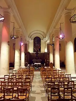 L'intérieur adopte un plan basilical classique. Le vaisseau central est un peu moins large que ne le suggère la façade : sa largeur est équivalente à celle des deux collatéraux réunis. La hauteur sous le sommet de la voûte dépasse de moitié la largeur, ce qui confère à la nef un aspect élancé. Les colonnades qui la séparent des bas-côtés sont formées par cinq colonnes doriques de chaque côté, et par un pilastre au début et à la fin. Les unes et les autres sont dépourvus de cannelures, et leur diamètre diminue successivement du bas vers le haut. Les bases, composées de deux ressauts et d'un gros tore, ne sont pas flanquées de griffes aux angles, et reposent sur des socles cubiques. Les chapiteaux présentent une frise aniconique délimitée par deux baguettes. Un quart-de-rond établit le lien avec le tailloir carré. Celui-ci est au profil d'une plate-bande et d'un bandeau saillant. Les tailloirs supportent une poutre sans aucune mouluration, sur laquelle repose une sorte d'entablement caractérisé par un grand nombre de moulures et de ressauts. La métope est en revanche nue. Elle est établie en encorbellement par rapport à l'architrave, et la corniche est établie en encorbellement par rapport à la métope. Le profil de la corniche est composé, du haut vers le bas, d'une plate-bande, d'un listel, d'une large doucine, d'une baguette et d'un filet. L'architrave est composée d'un quart-de-rond, d'une doucine moins large, et d'une plate-bande. Rien de l'entablement n'est visible depuis les bas-côtés, qui sont donc beaucoup plus simples. Leur intérêt réside dans les intéressantes perspectives qui s'ouvrent à travers la colonnade, jusqu'à l'autre colonnade en face. En plus, le fond des collatéraux abrite des retables, qui sont indissociables du développement architectural de l'édifice, et déclinent l'ordonnancement du portail[9].