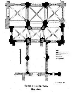 Au cours des années 1130-1140[11], l'église est en grande partie reconstruite, et en même temps, agrandie. La base du clocher est voûtée d'ogives, les piles et arcades sont reprises, et un second étage de baies est ajouté. Les croisillons et le chœur de l'église primitive sont démolis, et remplacés par des croisillons plus élevés, et un chœur plus large : ce sont ceux que l'on voit actuellement. Ils sont voûtés d'ogives dès le départ. La largeur du chœur roman était commandée par la distance entre les piles du clocher, alors que le chœur actuel s'évase dans sa partie antérieure, avant d'atteindre sa largeur définitive. La partie antérieure forme comme une sorte de demi-travée voûtée en berceau, et de telles travées existent également à l'est des croisillons. Ce sont les vestiges de deux absidioles, que l'on édifia en même temps que le nouveau chœur et les nouveaux croisillons. Elles devaient être en hémicycle et voûtées en cul-de-four, peu profondes, sans communication avec le chœur. La coexistence d'un chœur carré au chevet plat et d'absidioles en cul-de-four, issus d'une même campagne de construction, est très rare. Marcel Aubert n'a trouvé d'autres exemples qu'en Allemagne, mais il y a aussi l'état de l'église de Foulangues pendant la seconde moitié du XIIe siècle, et Dominique Vermand suppose que les parties orientales soient inspirées du plan du chevet de l'église du prieuré Saint-Jean-du-Vivier, commune de Mouy. À Saint-Jean-du-Vivier, une abside toujours en hémicycle est flanquée de deux absidioles. C'est l'introduction du voûtement d'ogives qui aurait favorisée l'adoption du chevet plat, car dans le premier temps du voûtement d'ogives, l'on ne sut faire que des voûtes rectangulaires. L'église de Mogneville fait partie d'un groupe d'une quarantaine d'églises dans l'Oise, qui possèdent des voûtes d'ogives romanes, antérieures à 1150. Dominique Vermand a identifié de nombreuses analogies stylistiques avec les églises voisines de Bury, Cambronne-lès-Clermont, Foulangues et Ully-Saint-Georges, qui donnent à penser que les voûtes de ces églises ont été construites par le même atelier[12],[13].