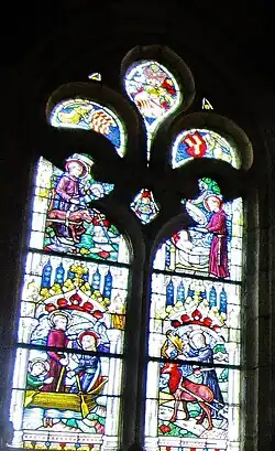 - Le loup menace les brebis. Les paysans prient saint Envel[8]. Ce panneau provient d’un autre vitrail[12].