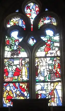 Dans l'abside, les meneaux des trois fenêtres ont été fleurdelysés à l'époque moderne, ce qui a nécessité une réorganisation du vitrail central en empruntant à différents vitraux du XVIe siècle[8]. Les lobes du lys sont remplis par l'histoire du miracle de la Sainte Hostie[8]. Au cœur du lys est une tête de vieillard[12].
