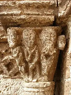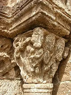 Remarquable chapiteau historié à gauche du porche d'entrée représentant le jardin d’Éden avec Adam et Ève couvrant leur nudité. Sur le côté gauche, on reconnaît Ève tenant la pomme et écoutant le serpent qui est dans l'arbre de la connaissance du bien et du mal et qui lui parle à l'oreille. Un crapaud qui comme le serpent symbolise le mal, se tient au pied de l'arbre. A droite, Adam se tient à côté du visage de Dieu. Juste en dessous du visage, on peut distinguer ce qui pourrait être une tête de chien, symbole de fidélité. A droite du visage, un fruit pendant d'une branche semble représenter l'arbre de vie.