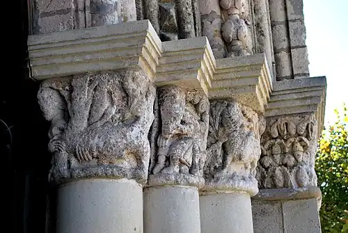 Les voussures des trois portes retombent sur des chapiteaux sculptés. Malheureusement les chapiteaux sont assez érodés et certains sont indéchiffrables. Les tailloirs modernes ont été mis pour tenter de protéger les chapiteaux, qui se dégradent depuis leur protection était enlevé en 1838.
