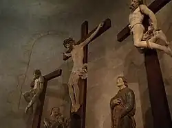Le calvaire conservé dans l'église est composé de six statues en noyer, grandeur nature. La présentation de ce groupe dans l'église date des années 1950. Elles provenaient d'un oratoire extérieur fondé en 1534 par le curé Jean Milet. Une restauration récente a relevé des traces de polychromie identique à celles du Christ en croix entre deux larrons de Ligier Richier de l'église Saint-Étienne de Bar-le-Duc [2].