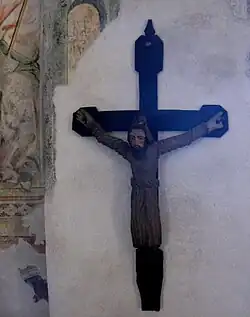 La fresque est précédée d'une autre, à sa gauche, dont on voit une partie. Le Christ en croix est loué par un chœur de trois angelots. Il est admiré par un couple de travailleurs, d'après l'outil porté par l'homme. L'homme est le valet Johannes du Krebishof, accompagné de sa femme, l'outil peut faire allusion à un accident qui se soit bien terminé[1]. Le sang jaillissant des plaies du Christ touche les lèvres de l'homme.
