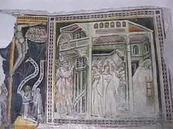 L'épisode de la dot des trois vierges de saint Nicolas de la fresque sur le côté ouest et traitée en trois pans : à gauche saint Nicolas qui tient une pièce d'or dans sa main; au centre les trois vierges, avec une pièce d'or qui vient d'être lancée et qui est encore en l'air, et à droite le père endormi, auquel l'une des vierges remet une pièce d'or. Sur la frange, en bas à droite, on voit clairement une inscription qui dit que la fresque est le don d'un certain Johannes, valet à la ferme « Krebishof » près de l’église, ferme qui existe toujours.