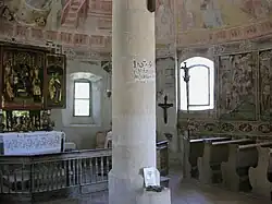 L'église est en forme de rotonde, aux voûtes à croisées d'ogives, avec un pilier central, le toit pointu initialement couvert d'ardoises en bois. L'église est décorée de fresques. Le clocher, avec ses fenêtres à lancettes et un toit pointu pyramidal, érigé sur le côté nord-est, a été ajouté probablement au XVe siècle. Selon la tradition, l'église a été frappée par la foudre au XVIe siècle qui a détruit une partie des fresques et menacé la stabilité de l'ensemble. Le pilier central en granite n'a été ajouté qu'en 1591 pour fortifier l'ensemble.