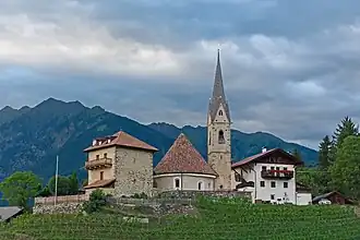 L'origine de la construction de l'église est inconnue. Elle est peut-être, d'après Notburga Unterthurner-Oberbichler, une collégiale, érigée par Oldoricus de Sennano, compagnon du comte Albert III du Tyrol (de), au retour de la quatrième Croisade[1] ou alors, selon Mathias Frei[2], comme une église construite pour servir à la population de la partie haute du village, et aux seigneurs de Scena comme une chapelle du château, jusqu'à ce que Petermann de Scena, favori de Marguerite de Carinthie fasse construire le château de Scena. Petermann de Scena cède la vieille chapelle « à ses cousins Reinprecht et Wernher » dans un acte de 1346 où l'église est documentée pour la première fois. L'église a été mentionnée dans un document[2].
