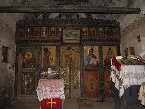 À l'intérieur, les murs sont ornés de fresques qui ne subsistent qu'à l'état de fragments ; parmi les scènes représentées figurent l'Annonciation (mur est) et la Communion des Apôtres sous les espèces du pain et du vin (abside) ; sur le mur sud figurent la Nativité du Christ, le Baptême du Christ et la Résurrection de Lazare et sur le mur ouest la Dormition de la Mère de Dieu. Le cycle des Grandes fêtes liturgiques était séparé des figures en pied par une frise de médaillons avec des bustes de saints. Selon leurs caractéristiques stylistiques et iconographiques, les fresques conservées datent des premières décennies du XVIIe siècle, lorsque l'église a probablement été peinte pour la première fois[4].