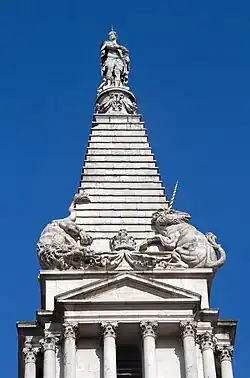 La tour à gradins est influencée par la description du mausolée d'Halicarnasse par Pline l'Ancien, et surmontée d'une statue du roi George Ier en costume romain. Ses statues de lions et de licornes combattantes symbolisent la fin récente de la Première Rébellion Jacobite. Le portique est basé sur celui du temple de Bacchus à Baalbek, au Liban.