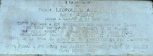 Une fontaine est érigée boulevard des Pins par les habitants de Cannes en mémoire du prince Léopold d'Angleterre, duc d'Albany. La pierre est posée par Albert Edward, prince de Galles le [6]. Un banc de pierre érigé par la reine Victoria en mémoire de son fils se trouve sur la place de la Castre au Suquet.