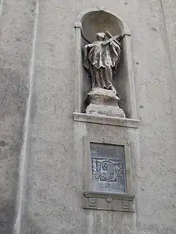 La verticalité de la façade principale est marquée par un ensemble de quatre pilastres qui sont entourés de deux niches ornés d'anges baroques et qui sont couronnés par une grande corniche moulurée ; plus hauts, deux autres pilastres encadrés de volutes et portant chacun un pot à feu, aboutissent à un tympan en demi-cintre ; la façade est dominée par un clocher à bulbe[1].