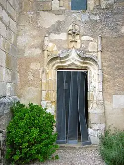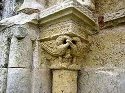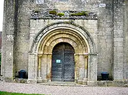 Sur la façade se détache un portail en plein cintre dénué de tympan, logé dans un avant-corps qui augmente la profondeur des voussures. Celles-ci sont formées de trois rangs de claveaux et de deux gros boudins coupant les angles rentrants et terminés par des congés. Ils s'appuie sur des chapiteaux dont l'un est décoré d'oiseaux aux cous enlacés.