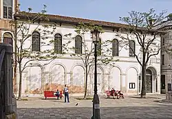 L'entrée, donnant sur le Campo San Vito, a été aménagée dans la première arche de la structure de l'immeuble et se compose d'un portail simple avec un toit semi-circulaire en pierre d'Istrie, surmontée d'un bas-relief représentant Saint Georges terrassant le dragon et flanqué de deux panneaux latéraux en bronze, également décoré de bas-relief.