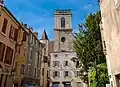 Le clocher principal est une tour carrée couronnée par un attique à balustres. Le clocher est situé sur le flanc méridional[8].