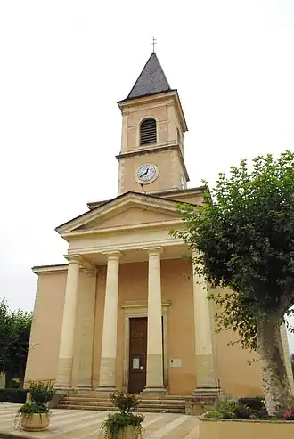 L’entrée de l’église est précédée d’un péristyle composé de quatre colonnes d’ordre dorique, surmontées d’un entablement et d’un fronton.