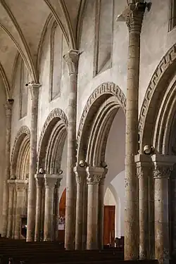 L'arc triomphal, à l'entrée du chœur, constitué d'un arc brisé composé de trois archivoltes est gothique, alors que les chapiteaux, pauvres en décor (godrons peu marqués, feuillages), sont romans. Sont également conservées six pierres tombales avec des inscriptions funéraires[8].