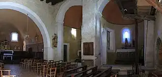 L'église est à nef unique après la réunion des anciennes chapelle castrale et salle de justice. Cette réunion s'est accompagné d'une réorientation de l'édifice. Le nouveau chœur a été placé au nord. Les deux absides sont couvertes en cul de four. Le chœur est couvert d'une voûte en berceau. La nef est couverte d'un plafond.