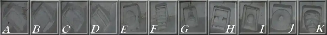 - le plus ancien est la tombe médiévale tectiforme et cruciforme déposée le long du chœur de l'église à l'extérieur. Elle est en pierre calcaire. Elle occupait une place importante à l'intérieur de l'église avant d'être déménagée durant les nombreuses restaurations de cette dernière. La tombe pouvait accueillir sur sa face supérieure trois cierges d'un diamètre de cinq centimètres. Il n'y a aucune inscription visible ;